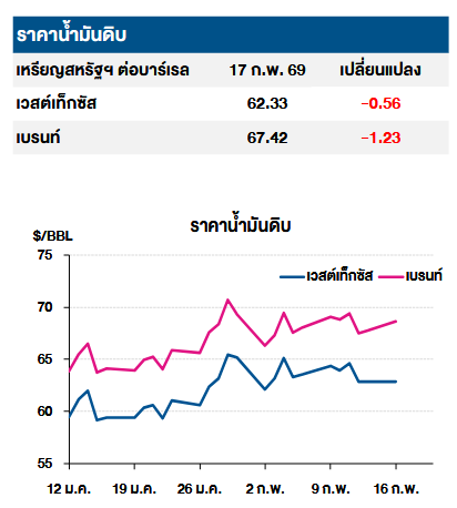 โดยราคาน้ำมันดิบเวสต์เทกซัสซื้อขายเมื่อ 17 ก.พ. 69 อยู่ที่ 62.33 เหรียญสหรัฐต่อบาร์เรล ลดลง -0.56 เหรียญสหรัฐ และราคาน้ำมันเบรนต์อยู่ที่ 67.42 เหรียญสหรัฐต่อบาร์เรล ลดลง -1.23